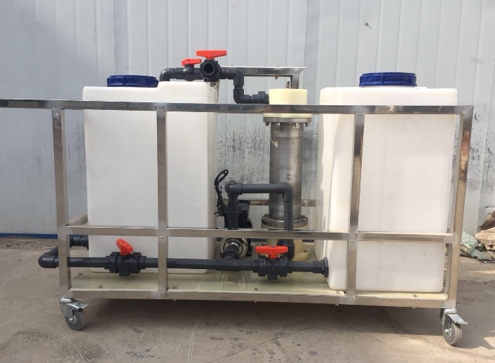 該套次氯酸鈉消毒水設(shè)備由德臣工貿(mào)公司自行研發(fā)設(shè)計生產(chǎn),核心部件電解槽采用我公司自產(chǎn)的管狀鈦基貴金屬涂層電極,具有電解效率高、耐腐蝕、使用壽命長等特點(diǎn)。設(shè)備采用多閥門控制管路,可根據(jù)不同的需求,通過調(diào)節(jié)水量大小和循環(huán)次數(shù),獲得不同濃度的次氯酸鈉消毒水。設(shè)備運(yùn)行功率只有100W左右,但制水量可達(dá)2噸/小時以上,有效氯含量在50mg/L以上。我公司可根據(jù)客戶的不同要求,定制各種消毒水生產(chǎn)設(shè)備,歡迎來電咨詢。